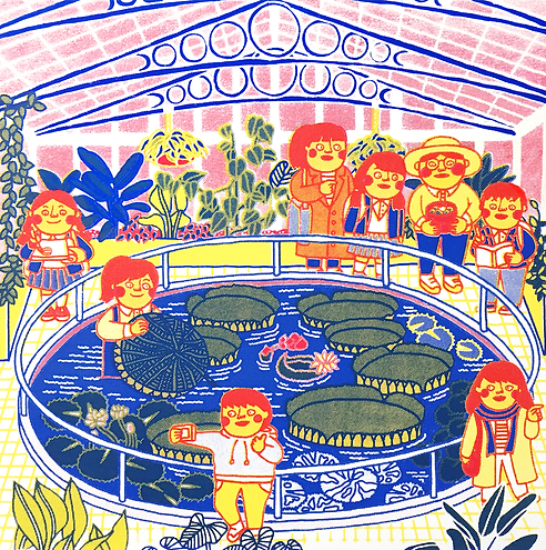 摺頁書正面為三個溫室的場景插畫,可以看見不同種類恣意生長的植物以及興奮地參觀的遊客,三張插畫以溫室外觀的玻璃和鋼骨結構做連結,呈現出植物園溫室裡的日常生活。摺頁書背面內容,則是挑選出各個溫室裡具代表性的植物二至三種,藉由Ollie生動的解說,讓讀者對於這些植物的背景故事和特別之處能有進一步的瞭解。整個作品以絹版印刷(Screen Printing)的方式去製作,運用鮮豔的紅、黃、藍色展現出溫室裡面溫暖並且充滿活力的多樣面貌。